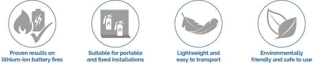 Environmentally friendly, our revolutionary fire extinguishing agent for lithium-ion battery fires is the only product of its kind – offering a unique and effective lithium battery fire protection for you and your property.